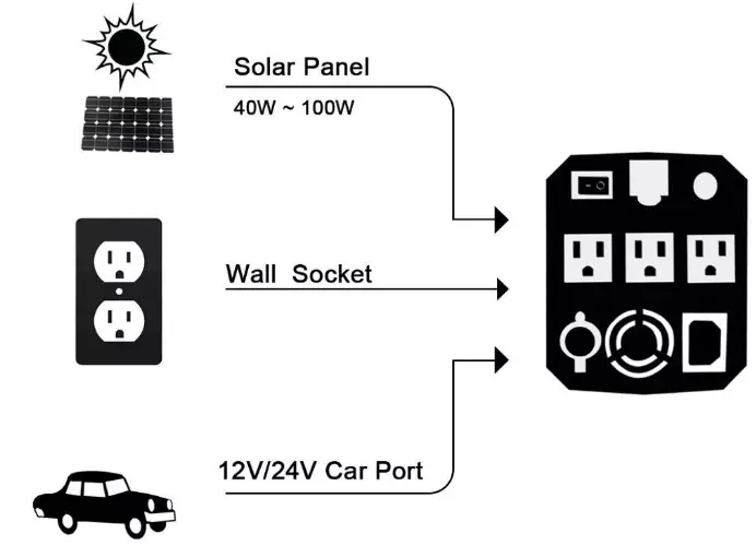 Jako wyjście AC / DC 12 v / 220 v / 5 v, nadaje się do różnych urządzeń, takich jak telefony komórkowe, tablety, laptopy, małe drukarki, rodzaje lamp i latarni, małe podgrzewacze do akwariów, sprzęt fotograficzny,