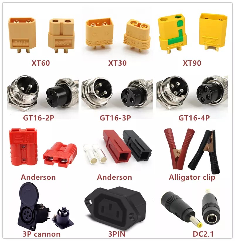 2. Złącze rozładowcze: Dostępnych jest 12 rodzajów opcjonalnych, jak na zdjęciu poniżej. Dostarczymy goły kabel lub lutowany ze złączem domyślnym, jeśli nie jest to wymagane.